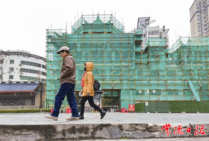 ????2月9日上午,常德市城區詩墻公園,排云閣正在維修改造之中。此次維修改造主要內容包括詩墻四閣外裝飾、室內水電及旅游公廁等。據詩墻管理處工作人員介紹,武陵閣將打造為舉辦各類書法、文創活動的大型展廳,春申閣則設置為一個詩墻修建展的固定展廳,工程預計4月完工。改造完成后,“詩墻四閣”將為市民游客提供一個高標準、有內涵的文化交流場所和文創精品展示地。 記者 李龍 攝