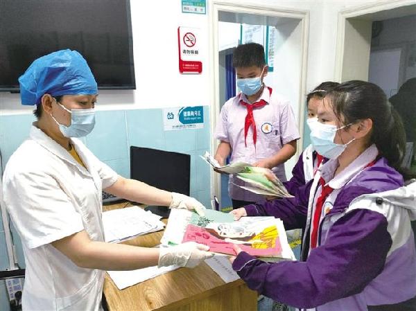 ????4月12日下午3時許,武陵區(qū)白馬湖街道社區(qū)衛(wèi)生服務(wù)中心迎來了一群特殊的“來訪者”,來自工農(nóng)小學(xué)的師生們。為感謝服務(wù)中心的醫(yī)務(wù)人員前幾天為他們做核酸檢測時所提供的優(yōu)質(zhì)服務(wù),學(xué)生們特意送上了自己創(chuàng)作的手繪漫畫。 肖志芳 葛詩倩 攝