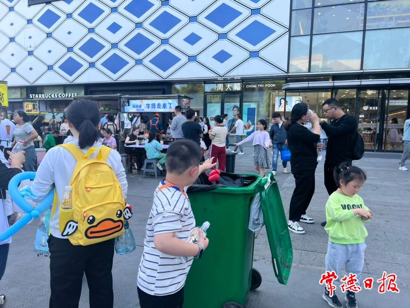 常德日報記者 李紫瑩 李雪芹 文/圖 5月1日晚6時許,常德萬達廣場的星光夜市人頭攢動,市民游客邊逛邊吃的同時,不忘將垃圾丟進垃圾桶,文明旅游儼然已成共識。