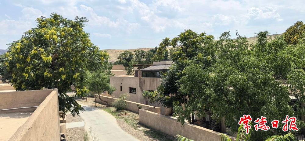去酒店的路上,半空中飄蕩著白色的絮狀物,孩子們問那是什么。瑤瑤說,是胡楊樹的種子。遠(yuǎn)處,山巒上隱隱現(xiàn)出一段長(zhǎng)城的殘留。近處,是一條通向黃河的水泥小路,河對(duì)岸就是沙坡頭景區(qū)。接駁車往右拐了個(gè)彎,便正式進(jìn)入住宿區(qū)了。一眼望去,就是傳說中的西北“土坯平頂房”建筑群。砂礫色的背景,疏朗有致的綠樹,頗有異域風(fēng)情又不乏安全感。畢竟,這是在咱大中國(guó)。
