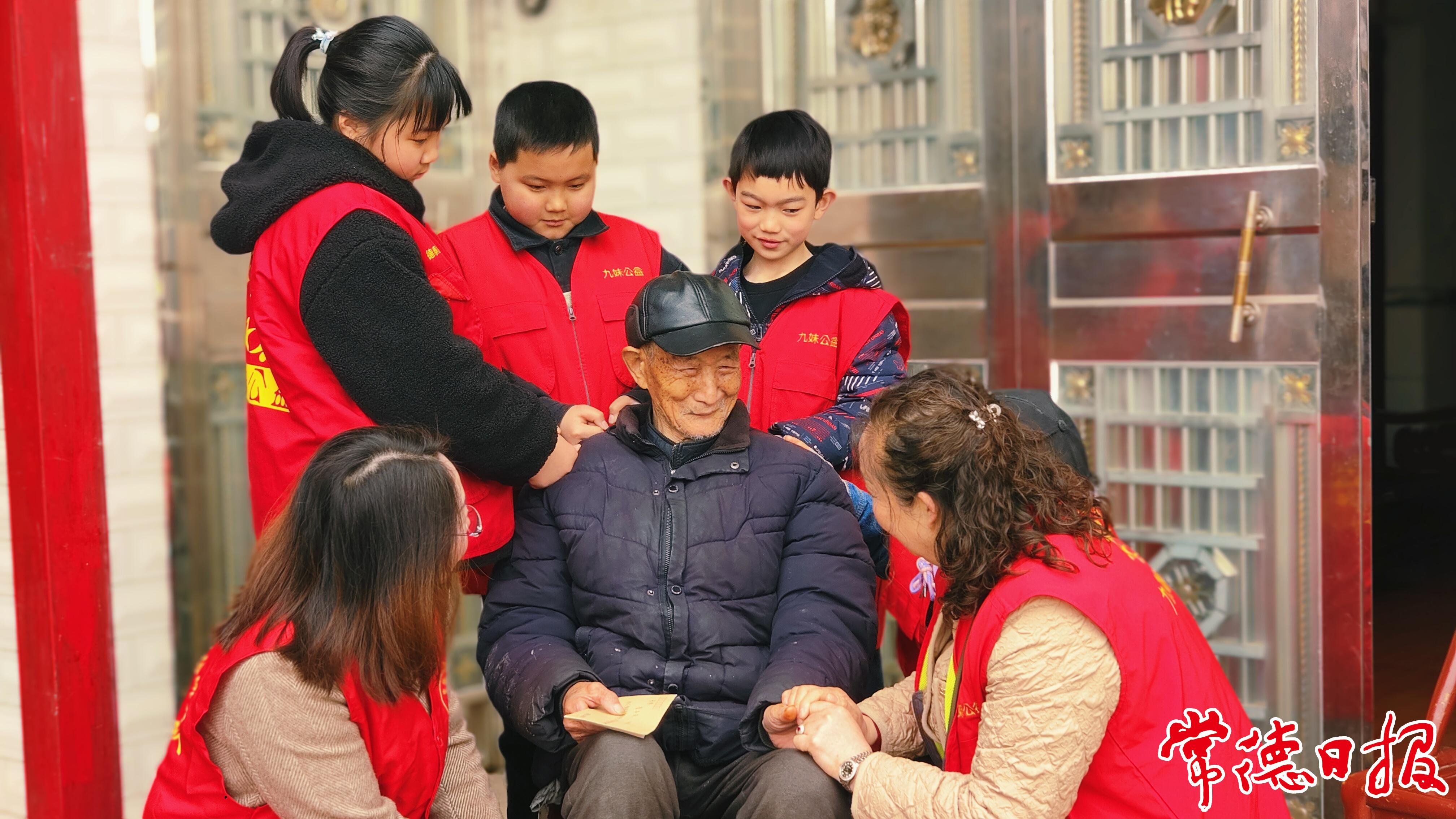 抵達抗美援朝老兵翦老家中時,翦老雖行動不便,仍堅持在兒子攙扶下起身迎接。小小志愿者們整齊站成一排,莊重地敬上少先隊員隊禮,翦老眼眶泛紅,回以標準軍禮。這一敬一回,跨越了漫長歲月,現場的人無不為之動容。小橙細心地為翦老拉好外露褲腿,關心道:“爺爺,今天冷,您別凍著。”小媛領讀《給抗美援朝老兵的一封信》,字里行間飽含對老兵的深深敬意。隨后,翦老激動地唱起《中國人民志愿軍戰歌》,他沙啞卻有力的歌聲,將眾人帶回那個戰火紛飛的年代,志愿者們的掌聲經久不息,表達著對老兵的由衷贊美和崇高敬意。