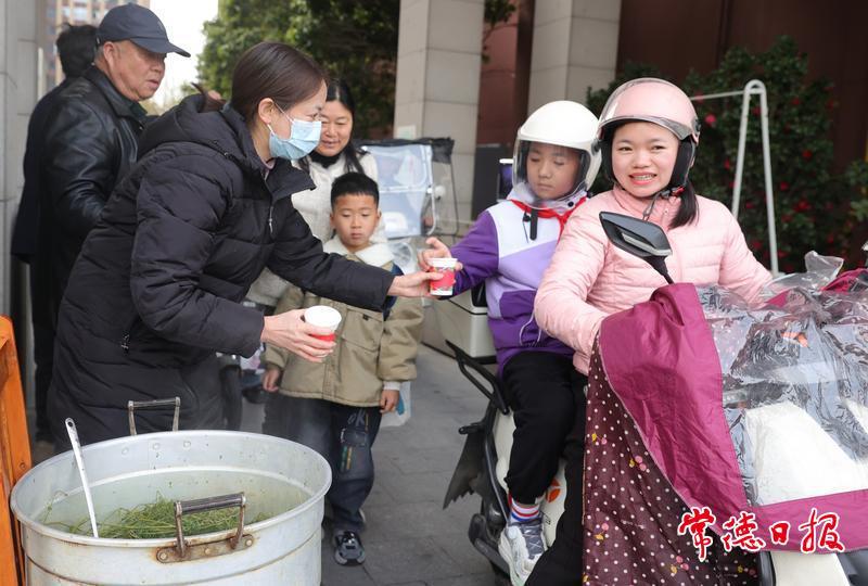 常德日報記者 徐珊珊 文/圖 3月31日正值農歷三月初三,市城區富新·瞰江南小區物業工作人員提前一天做好地米菜(薺菜)煮雞蛋,一大早在小區門口分發給業主,獲得業主點贊。