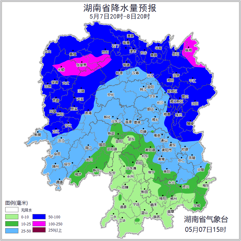 今天白天,湘中以北陰天有大到暴雨,其中懷化(沅陵)、湘西州(永順)、張家界(市區、慈利)、常德(桃源)、岳陽(市區、臨湘、平江、岳陽縣)大暴雨,其他地區陰天有小到中等陣雨或雷陣雨;湘南南風2~3級,其他地區南風轉北風3級,雷雨時局地陣風8~10級;最高氣溫湘中以南27~30℃,其他地區24~26℃;最低氣溫湘東南19~21℃,其他地區16~19℃。