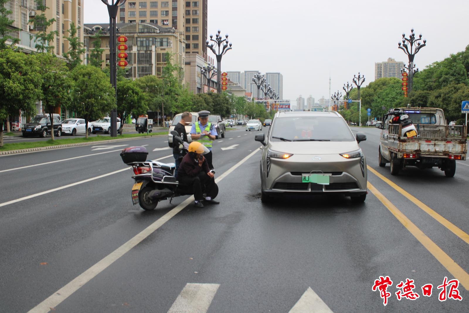 常德日報記者 王敏 通訊員 何梓涵 文/圖 近日,常德市鼎城區陽明大道上,陳某駕駛二輪電動車在等待綠燈通行的車輛間隨意穿行,他在由西往東橫穿陽明大道時,與謝某駕駛的沿陽明大道由北往南正常行駛的小型客車發生碰撞,電動車當場倒地。事故造成兩車不同程度受損,陳某輕微受傷。