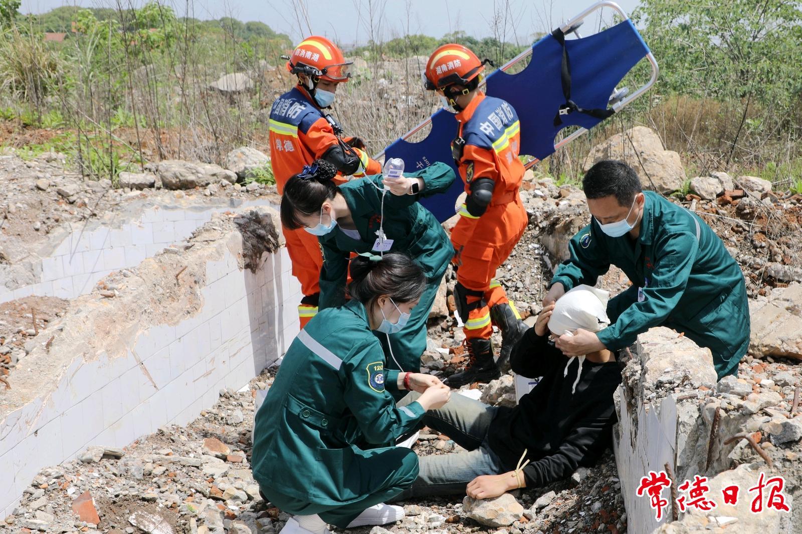 “報告,現(xiàn)場有居民頭部異物砸傷頭部外傷,請求醫(yī)療救援?!钡卣鹁仍菥毈F(xiàn)場,模擬當?shù)匾痪用裥^(qū)因地震導致建筑坍塌人員被困受傷。接到報告后,消防員、醫(yī)院創(chuàng)傷急救中心醫(yī)護救援隊成員立即展開創(chuàng)傷現(xiàn)場醫(yī)療救護,為“受傷”居民包扎傷口、抬著他翻越殘垣斷壁,緊急護送居民到120救護車。