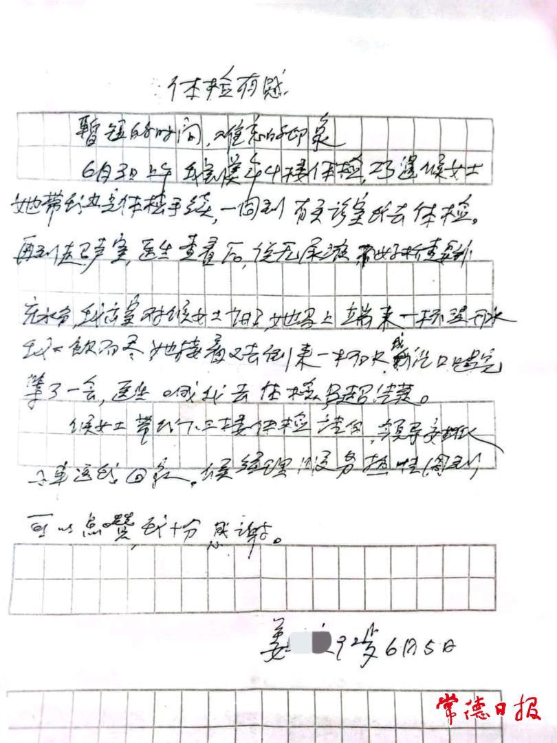 時(shí)間回溯至6月3日上午,姜老先生來到美年大健康進(jìn)行體檢。老人在進(jìn)行B超檢查時(shí),因沒有尿液無法繼續(xù),正當(dāng)老人有些著急時(shí),工作人員侯儒艷主動(dòng)上前詢問情況,并立即倒來兩杯溫開水。老人飲用后稍作休息,檢查得以順利完成。更讓老人感動(dòng)的是,體檢結(jié)束后,中心還特意安排車輛將他安全送回家中?!拔夷昙o(jì)大了,去過很多地方,但你們的服務(wù)讓我覺得特別貼心!”姜老先生在信中寫道。