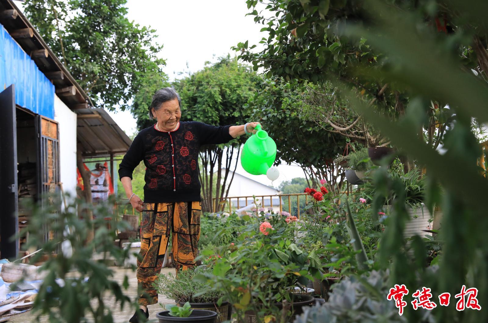 夏日清晨,88歲的村民楊幺妹早起侍弄自家院子的幾十盆花草,月季開得正艷,多肉在瓦盆里挨挨擠擠。