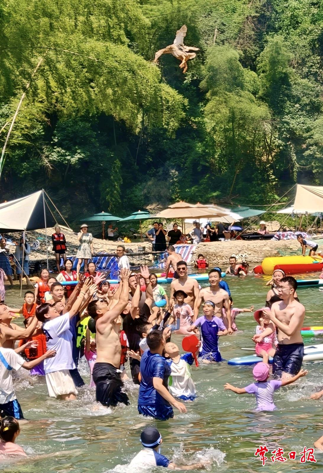 連日來的高溫天氣,讓市民紛紛尋找避暑好去處,桃源縣沙坪鎮歡竹溪水部落迎來了大批游客,成為消暑度夏的“新寵”。8月1日,記者在現場看到,前來游玩的市民游客絡繹不絕。水上樂園里,市民游客盡情嬉戲,或在溪水中暢游,或是體驗水上槳板、抓鴨子比賽、摸魚比賽等水上娛樂項目。常德日報記者 劉頌 攝