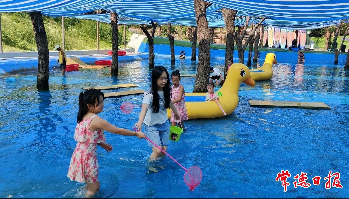 淺水區(qū)里,孩子們擼起袖子、提著小網(wǎng)兜,專注地盯著水中游動的泥鰍?!白サ嚼玻 鼻宕嗟臍g呼聲不時響起,孩子們小手攥著裝有泥鰍的玻璃瓶,臉上滿是雀躍。亮黃色的鴨子小船上,他們有的握著船槳輕輕晃動,看到魚兒游過,直接棄船摸魚,歡笑聲隨著水波擴散。
