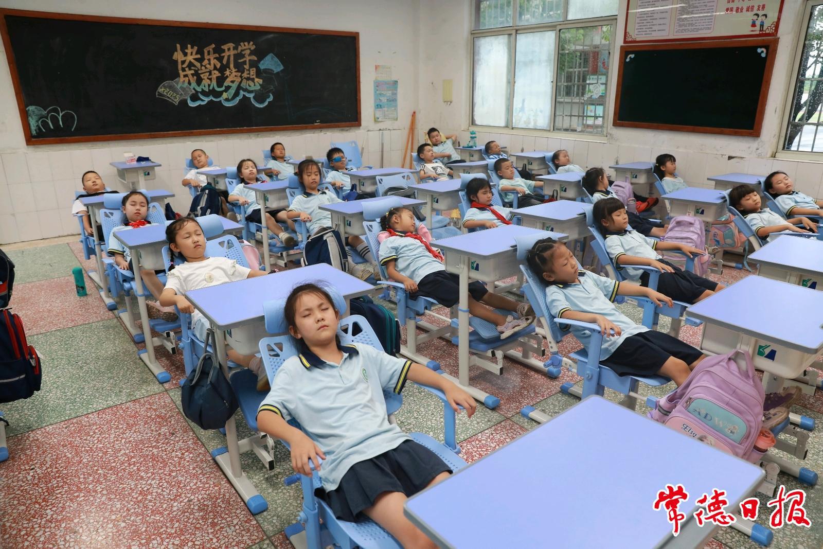 常德日?qǐng)?bào)記者 江一舟/文 李龍/圖 “這個(gè)午休課桌椅好好用呀!我自己動(dòng)手就能調(diào)整好?!?月2日中午,武陵區(qū)丹洲鄉(xiāng)中心小學(xué)二年級(jí)108班教室內(nèi),同學(xué)們?nèi)齼蓛苫氐阶?,熟練地把書本塞進(jìn)書包,接著握住課桌椅側(cè)邊的調(diào)節(jié)桿輕輕一扳,原本豎直的椅背緩緩向后傾斜,大家順勢(shì)躺靠在椅背上,老師貼心地關(guān)掉教室內(nèi)的燈光,整個(gè)班級(jí)瞬間進(jìn)入安靜的“躺睡”模式。