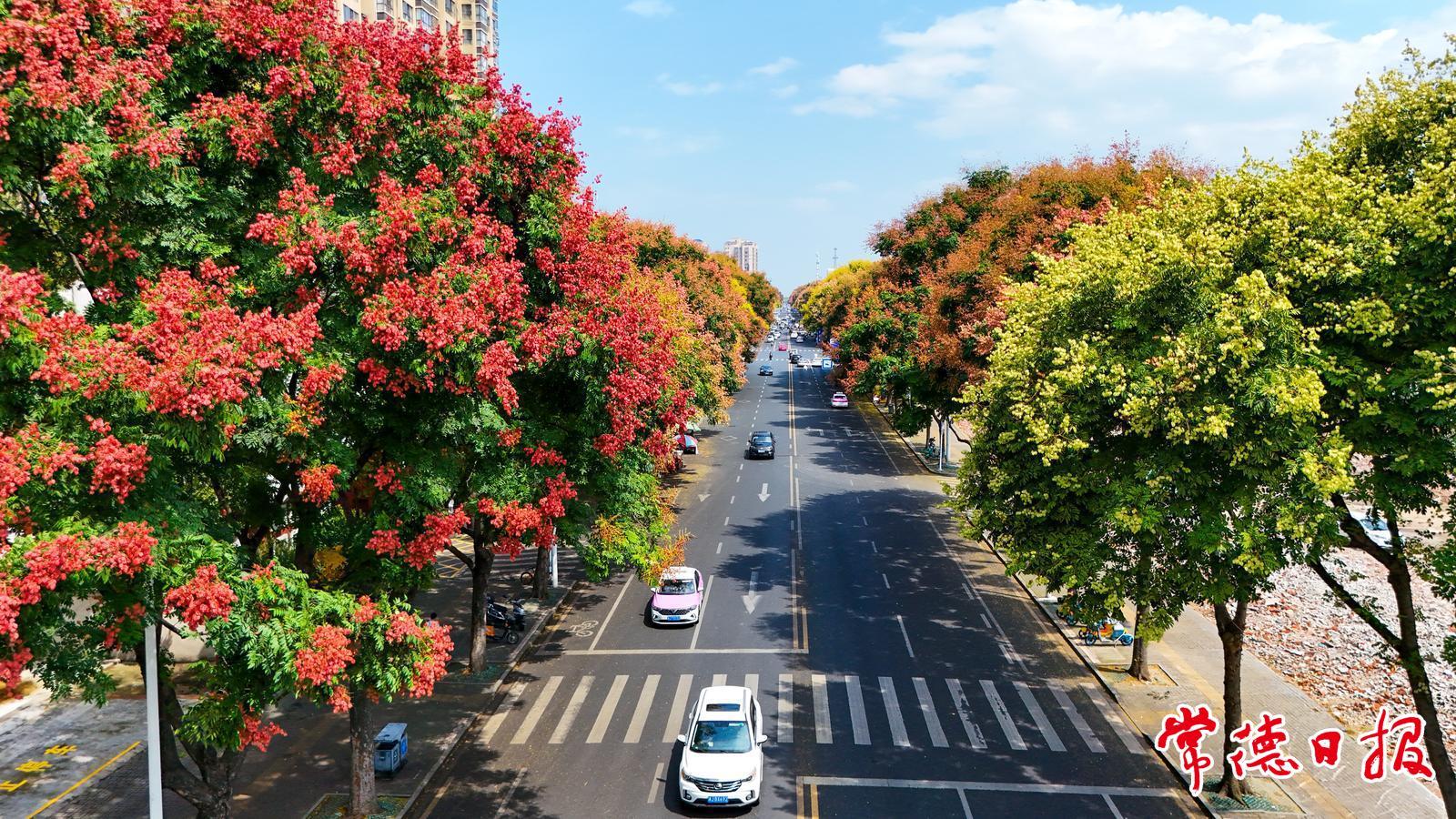 誰能想到,進入秋天,常德的街頭就像打翻了調色盤,嫩黃、淺紅、深紅先是輪番登場,然后同臺演出,街頭巷尾也從明亮瞬間變成斑斕,如同在藍天白云下展開了一幅幅畫卷。