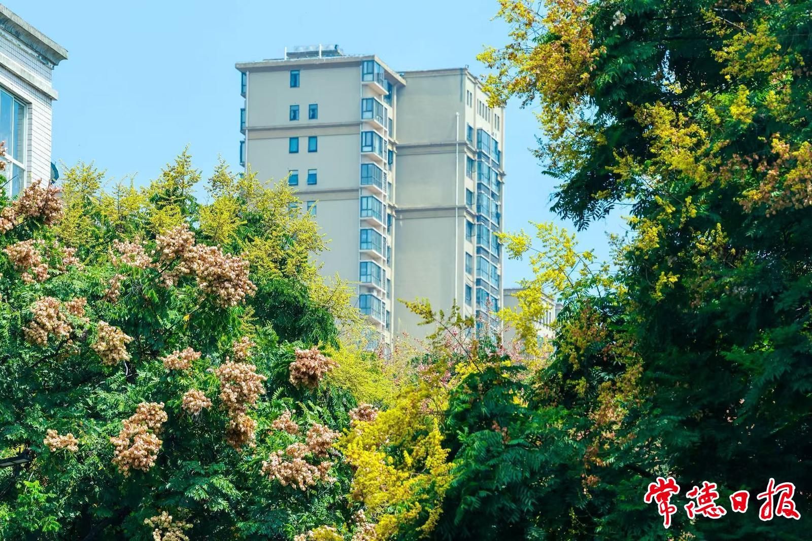 市城區水星·香榭里住宅小區的大門兩側,欒樹的枝頭異常熱烈,綠是沉靜的,黃是明凈的,粉是明媚的,紅是奔放的,每棵欒樹的樹梢都像一個舞臺。從小區里走出來的居民,立即就被這種熱烈粘住目光。小區對面的公交站臺上,幾位等車的市民都舉著手機拍照。這是9月12日下午,記者在常德市城區青年路上看到的場景。這些照片很可能會在當天或者幾日后,出現在微信朋友圈及其他社交平臺。幾周前,微信網友“宇文川穹”就發了龍港路的欒樹視頻,好似綠色的枝頭停滿了黃色的飛鳥。沒幾天,網友“檀木先生”的美圖又亮相朋友圈,嫩黃與深紅襯著碧藍的天空,明亮干凈,一如壁紙,配文亦與照片輝映:一棵欒樹開花有先后,有些已結出嫩果,更多的花卻正接連綻放——一邊是落花滿地,一邊是繁花滿樹。它們就這樣層層疊疊,黃的花、紅的果、綠的葉,交織出繽紛的層次,把整個初秋渲染得明亮而熱烈。