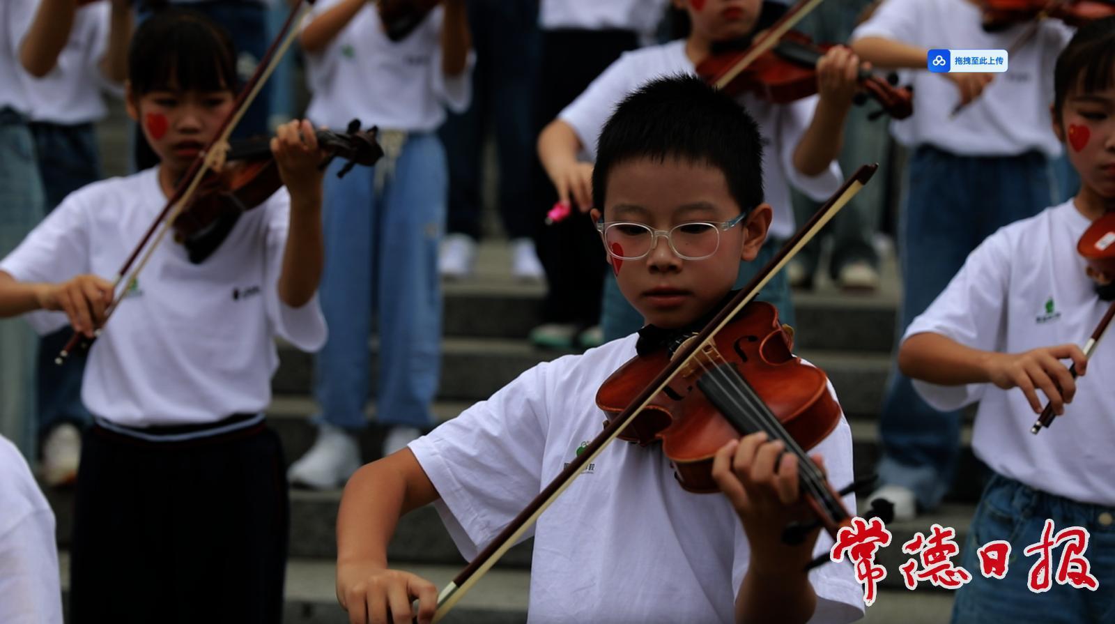常德日報記者 姚璇 文/圖 9月27日上午8時許,常德博物館前坪響起《紅星閃閃》的熟悉旋律,一場由百余名青少年參與的迎國慶“快閃”活動在此舉行。參與此次活動的少年來自常德啟明星小提琴鋼琴藝術學校、呱呱聲樂學校及武陵合唱團。他們用清澈的歌聲、嫻熟的小提琴演奏技巧和飽滿的熱情,吸引了清晨往來市民的目光,也為即將到來的國慶節增添了青春的亮色。