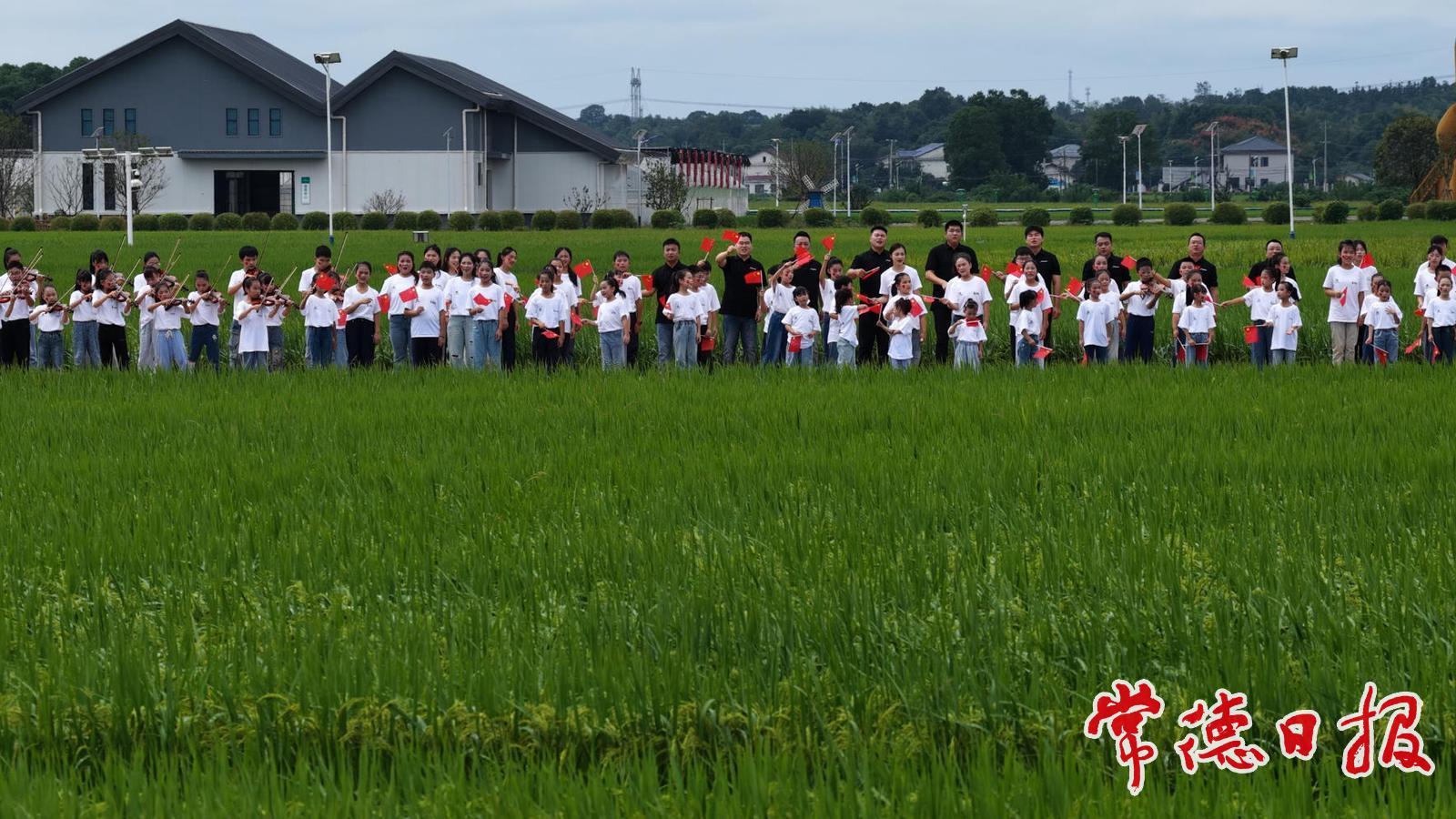 歌聲在稻田上空飄揚,鼎城區相關領導、港中實業集團干部職工、謝家鋪鎮干部職工代表手持國旗,從不同方位匯聚而來。新農人與鄉村講解員代表在田埂上放聲歌唱,湖南應用職業技術學院學子揮舞著手中的旗幟,常德蟋蟀男聲合唱團、啟明星弦樂團與武陵合唱團的演出相得益彰。隨后,蟋蟀男聲合唱團帶來的《紅星閃閃》引發全場共鳴,揮舞的國旗與燦爛的笑容交織,現場氣氛溫暖而熱烈。