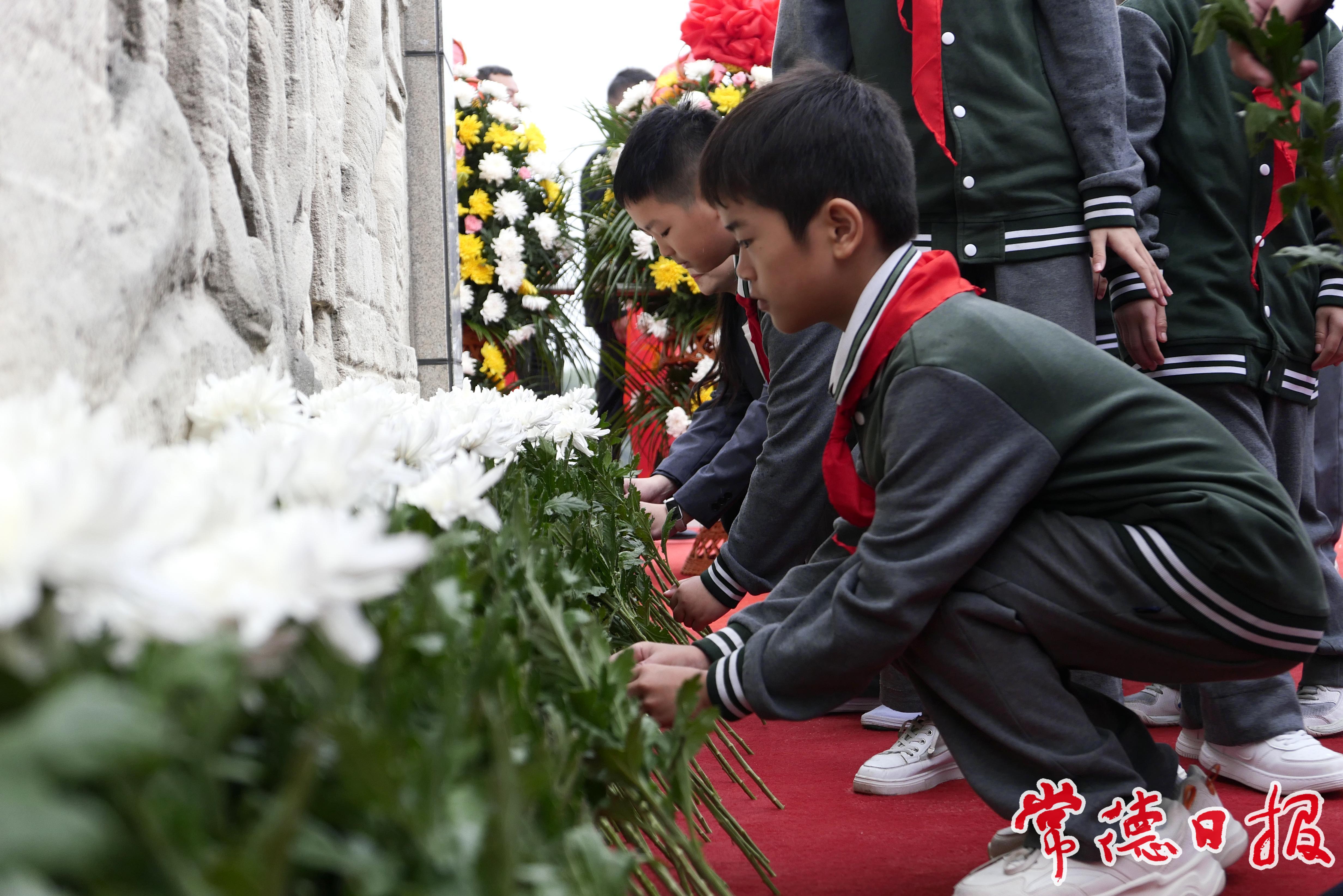 在深情的《獻花曲》中,禮兵將中共常德市委,市人大常委會,市政府,市政協,常德軍分區,各民主黨派常德市委會、市工商聯和無黨派愛國人士、各人民團體,常德市社會各界群眾,老戰士、老同志和烈士親屬,全市少先隊員敬獻的9個花籃托起,緩步拾級而上,在烈士紀念碑前排開。