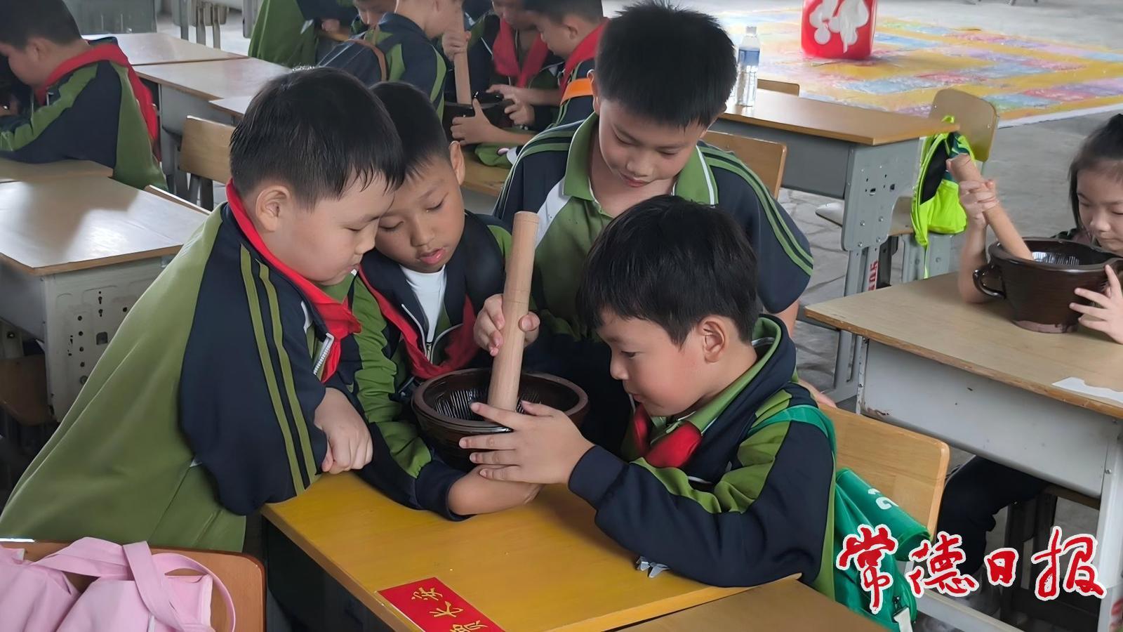 活動最后,“食米游戲”將整個研學推向了高潮。孩子們通過完成任務換取食材,親手制作常德傳統非遺美食——擂茶。隨著“咚咚咚”的敲擊聲,芝麻、花生、茶葉等配料在擂缽中慢慢變成粉狀。現場氣氛熱烈而歡快,學生們在體驗中不僅學到了農耕知識,更感受到了傳統文化的深厚底蘊。
