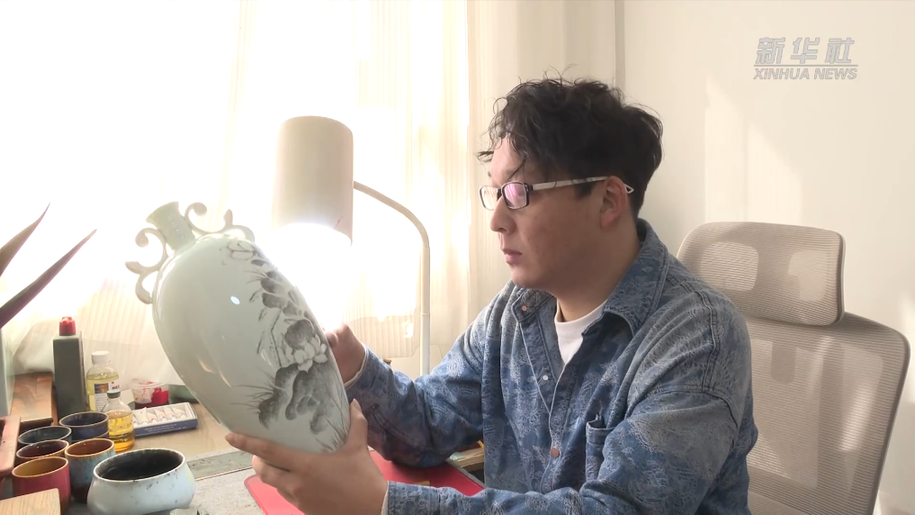 在山東省淄博市淄川區(qū)的津丞藝術(shù)工作室,劉津丞正手持刻刀和小錘在一件雙耳如意瓶上創(chuàng)作。清脆的敲擊聲中,一幅荷塘游魚圖逐漸呈現(xiàn)在瓶身上。1994年出生的劉津丞是淄博刻瓷技藝傳承人。19歲那年,他拜刻瓷大師李秋峰為師,開始系統(tǒng)學(xué)習(xí)刻瓷技藝,并將學(xué)校里所學(xué)的油畫知識(shí)融入到日常創(chuàng)作中。