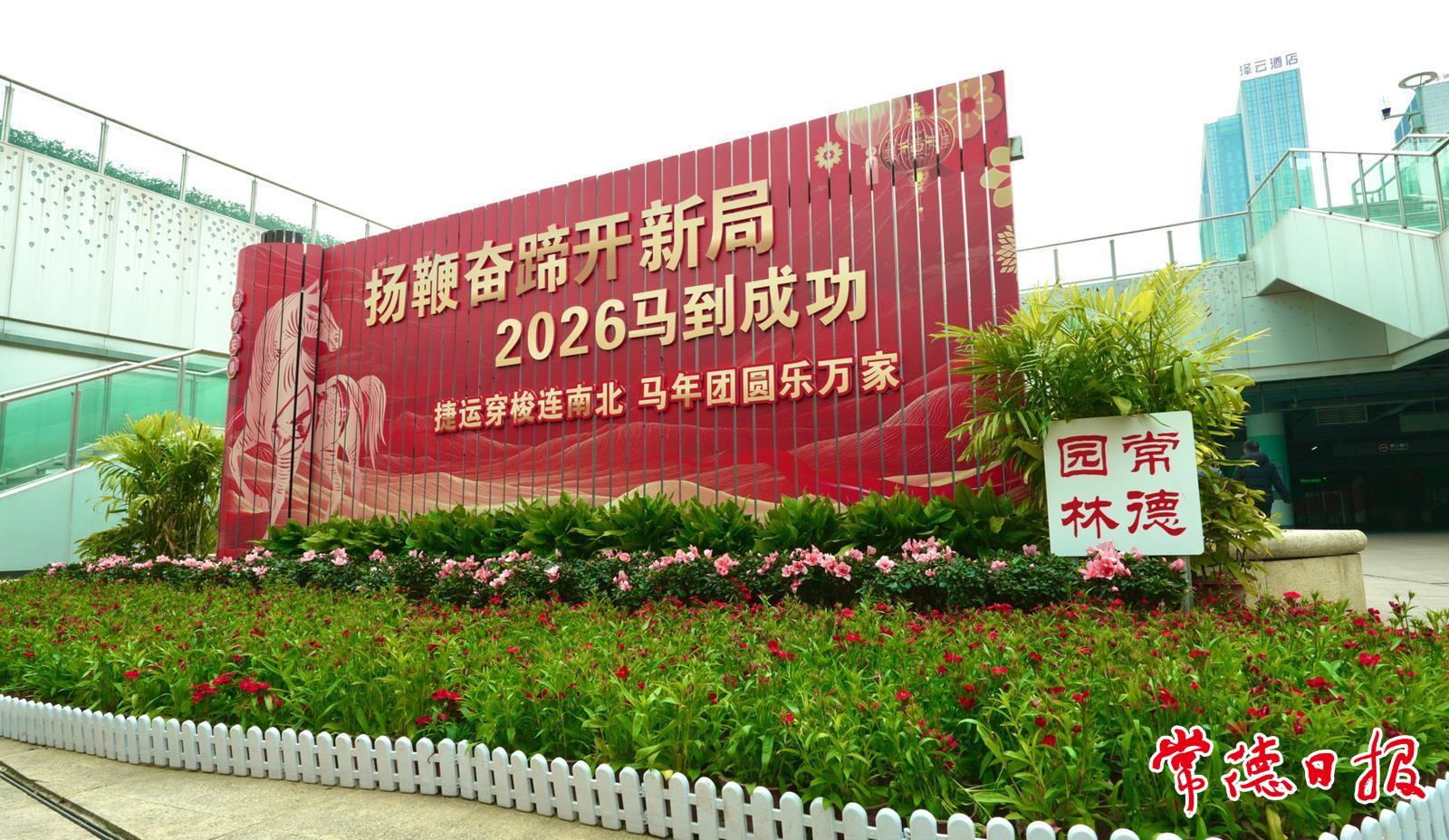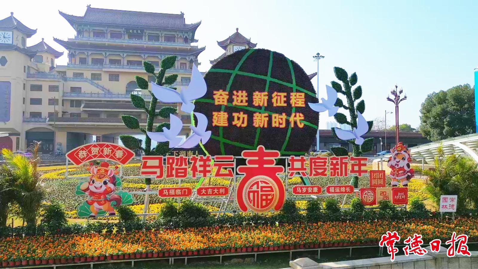 在武陵閣廣場,立體“春”字與鮮艷的花卉組合相得益彰。在濱湖公園和常德河街,花卉布置與周邊景觀巧妙融合,形成了一道道亮麗的風景線。在常德站南廣場出站口,精心布置的花卉景觀,吸引不少旅客駐足觀賞、拍照留念?!斑@些花卉布置得真漂亮,一出站就看到這么喜慶的景象,感覺年味越來越濃了?!眲傁禄疖嚦稣镜氖忻窭钆扛吲d地說。