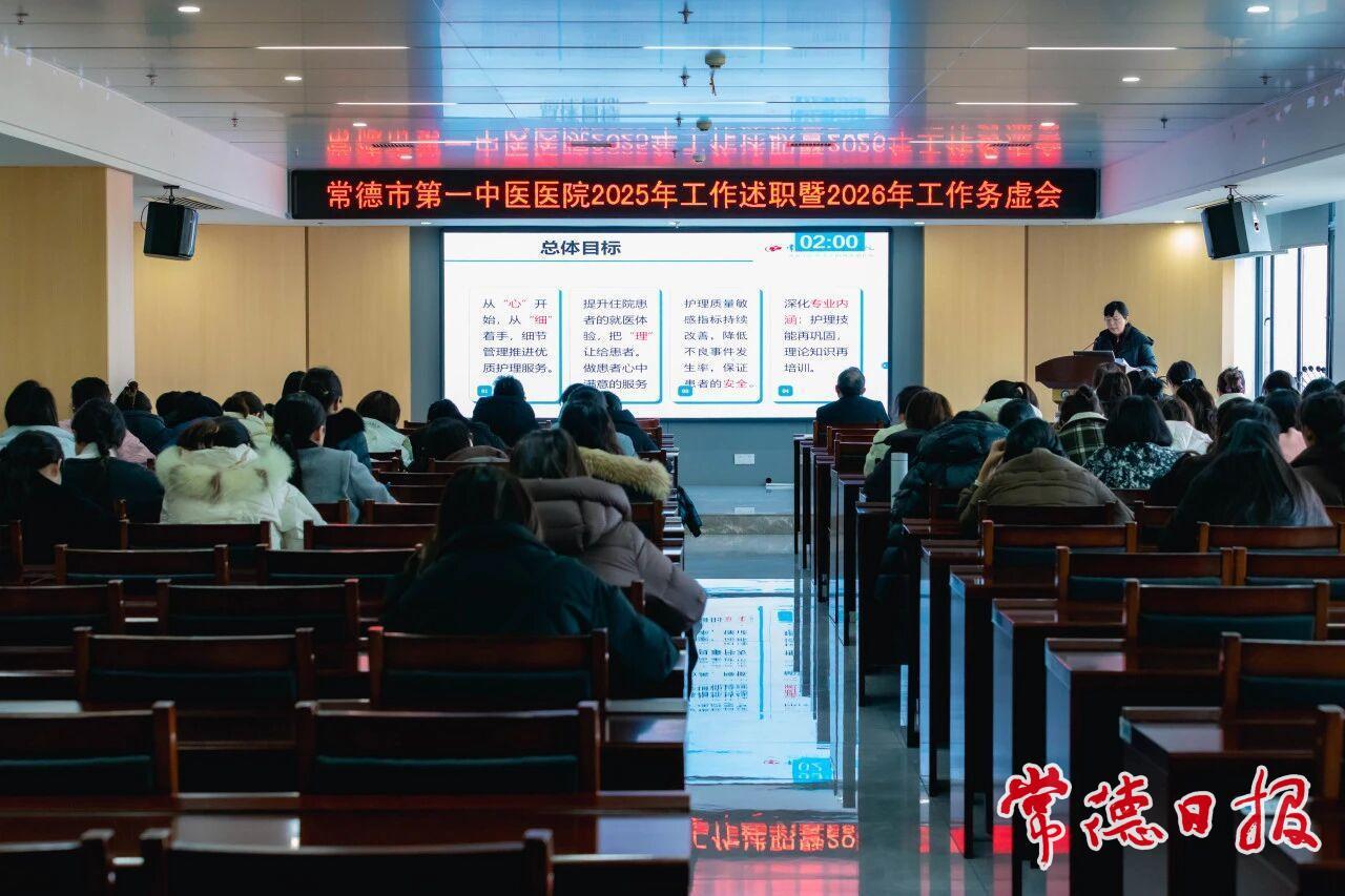 常德日報記者 王浪 通訊員 吳秀英 文/圖 近日,常德市第一中醫醫院組織召開2025年度工作述職暨2026年工作務虛會護士長專題匯報會。會議全面盤點過去一年護理工作,聚焦問題挑戰,并系統部署新年度重點任務,旨在進一步融合中醫特色,強化護理效能,推動護理服務高質量發展。醫院全體領導班子成員、各臨床醫技科室護士長及職能科室負責人與會。