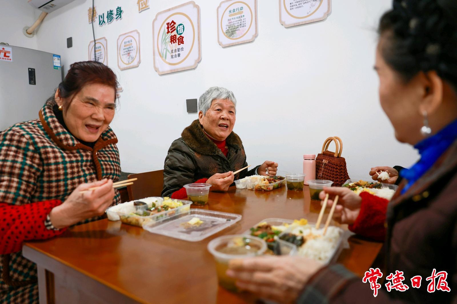 這家日間照料中心前身是縣人民醫院的閑置結算中心。煥然一新的玻璃外墻,門頭掛著新牌子,樓里改出了標準化配餐室、活動室和休息區等空間。配餐室門口,工作人員送來了一盒盒熱餐。活動室里,筷子碰著餐盒叮當響,老人們邊吃邊聊,不知誰說了句什么,哄笑聲炸開。