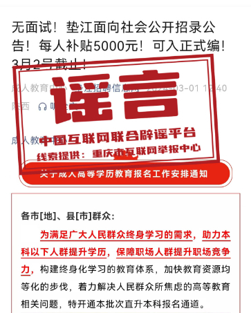 真相:近日,“墊江招聘信息網(wǎng)”微信公眾號(hào)發(fā)布信息:“無(wú)面試!重慶墊江面向社會(huì)公開招錄公告!每人補(bǔ)貼5000元!可入正式編!”部分網(wǎng)民看到該信息后誤認(rèn)為,墊江面向社會(huì)以補(bǔ)貼形式招錄具有正式編制的公務(wù)人員,于是紛紛向墊江縣有關(guān)部門致電咨詢招錄情況。經(jīng)核實(shí),近年來(lái),墊江未曾以補(bǔ)貼方式和不經(jīng)過面試招錄具有正式編制公務(wù)人員。該信息實(shí)則為成人學(xué)歷提升培訓(xùn)信息,而非正式編制公務(wù)人員招錄信息。墊江縣互聯(lián)網(wǎng)信息辦公室已依法對(duì)發(fā)布該信息的微信公眾號(hào)負(fù)責(zé)人進(jìn)行約談和教育批評(píng),指出虛假信息的危害性,并責(zé)令刪除相關(guān)信息。(來(lái)源:重慶辟謠)