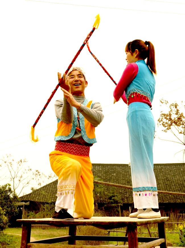 九子鞭因鞭子兩端各裝九枚銅錢而定名,九子鞭表演可一人獨打、雙人對打,也可群體表演,基本套式是蓮花八拍,分別用竹鞭拍打左右肩、左右手、左右腰、左右腳等八個部位,按此八拍延伸出六套模式,每套又分為八式,共四十八式,每式均有命名,如“百鳥起舞”“玉女纏腰”“蝶舞花叢”“靈猴舞鞭”等等,隨著竹鞭敲擊舞動,表演者做出單手拍、雙手舞花、盤繞等一系列動作,竹鞭發出富于節奏的“嚓嚓”聲,表演音樂伴以地方小調,韻律節奏明快,舞姿粗獷優美,令人目不暇接。