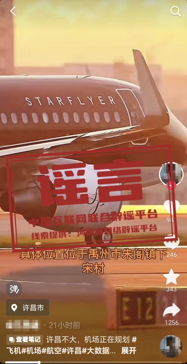 真相:近日,有網(wǎng)民在某平臺發(fā)布視頻稱:“未來河南許昌將建設禹州、襄城、鄢陵3個機場,其中禹州市的通用機場具體位置在朱閣鎮(zhèn)下宋村,項目總投資為10億元,計劃占地1000畝”等。經(jīng)向相關部門查證,三地的通用機場均處于前期謀劃階段,截至目前,暫未對選址地點、占地數(shù)量及投資金額進行具體規(guī)劃,視頻內(nèi)容為不實信息。(來源:“清朗河南”微信公眾號、網(wǎng)信許昌)