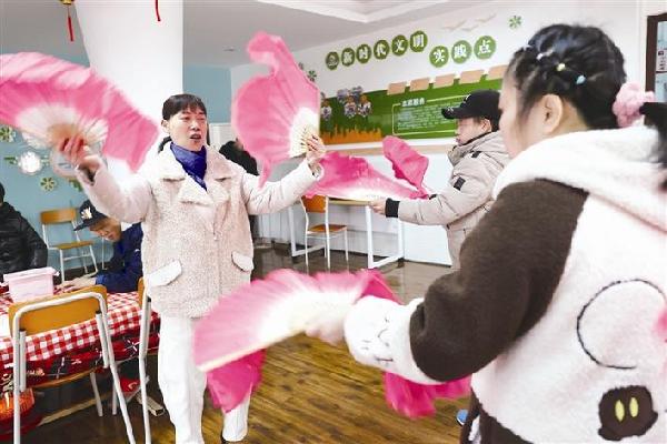 ????隨著春季新學期到來,市城區西城陽光家園同步開學。24名殘障學員開啟快樂新學期。圖為2月28日,老師帶領學員練習扇子舞。 尚一網記者 徐珊珊 攝