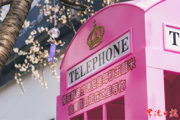 ????府坪街道和高山街工作人員在高山街沿街櫻花樹上懸掛許愿瓶,在高山街與建設路交會的綠化帶,高山街與烈士街交會處,高山街與人民路交會處三處設置打卡點,布置粉紅風車、粉紅電話亭、風鈴許愿瓶等裝置,供市民打卡拍照;對高山街與人民路交會處,高山街與和平街交會處,高山街與建設路交會處的三處人行斑馬線進行創意裝飾,裝飾成粉紅色斑馬線。