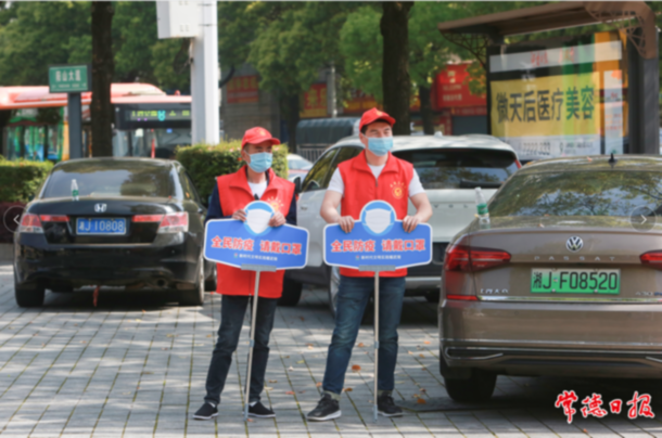 ????洞庭大道陽山大道交會處志愿者提醒市民佩戴口罩