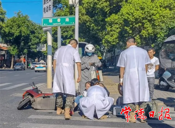 ????接到執勤官兵報告后,武警常德支隊立即派出應急小組及中隊衛生隊醫生趕往事發現場。任務官兵到達現場后,發現一輛摩托車傾倒在地,受傷女子側倒在車旁。經衛生隊醫生初步診斷,該女子左小腿皮膚大面積擦傷,左踝部有局部撕裂傷。為防止二次傷害,應急小組疏導路口交通、勸離圍觀群眾,并撥打120急救電話。