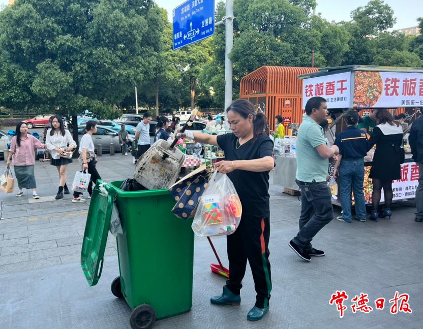常德日報記者 李紫瑩 李雪芹 文/圖 5月1日晚6時許,常德萬達廣場的星光夜市人頭攢動,市民游客邊逛邊吃的同時,不忘將垃圾丟進垃圾桶,文明旅游儼然已成共識。