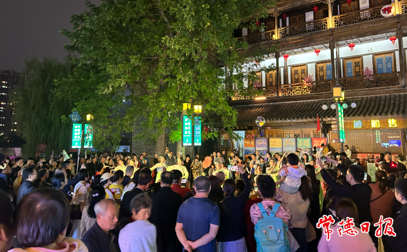 9月30日至10月5日期間,每天19時,常德絲弦、地花鼓、采蓮船、桃源板龍燈、舞龍舞獅等非遺項目便在常德河街接連上演,沉浸式的演出場景、精彩的非遺表演,吸引了眾多市民游客前來“打卡”拍照。大家一邊暢享街區(qū)內(nèi)的各色美食,一邊游覽觀演,盡情感受歡樂且充滿文化底蘊的常德夜生活。