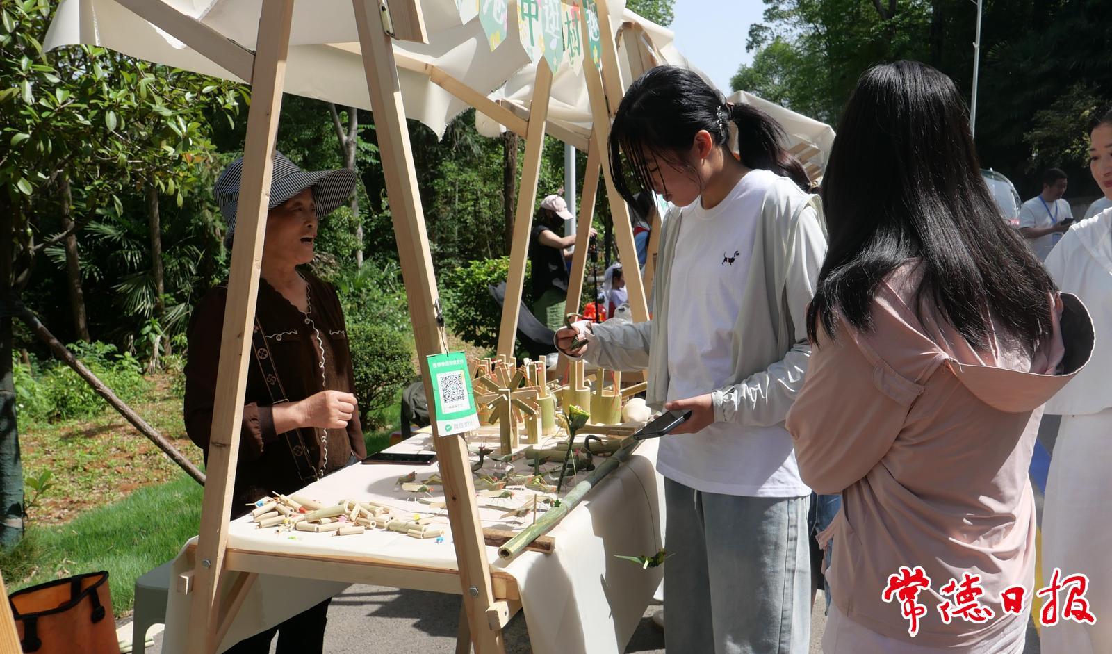 5月5日,港中坪片區傳統項目熱度不減。稻田棧道上游人悠然漫步,隨風起伏的稻浪與秋千上飛揚的裙擺相映成趣;鄉村市集內,竹編工藝品與現榨菜籽油吸引游客駐足選購。樹蔭下的休閑區,樂手淺吟低唱,游客三五一桌,圍坐品嘗咖啡、茶飲和各種美食,時光仿佛在這里慢了下來。