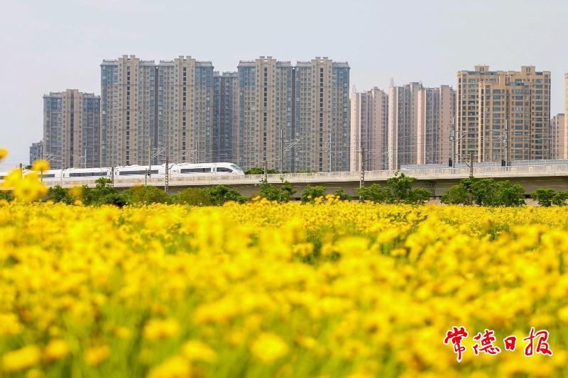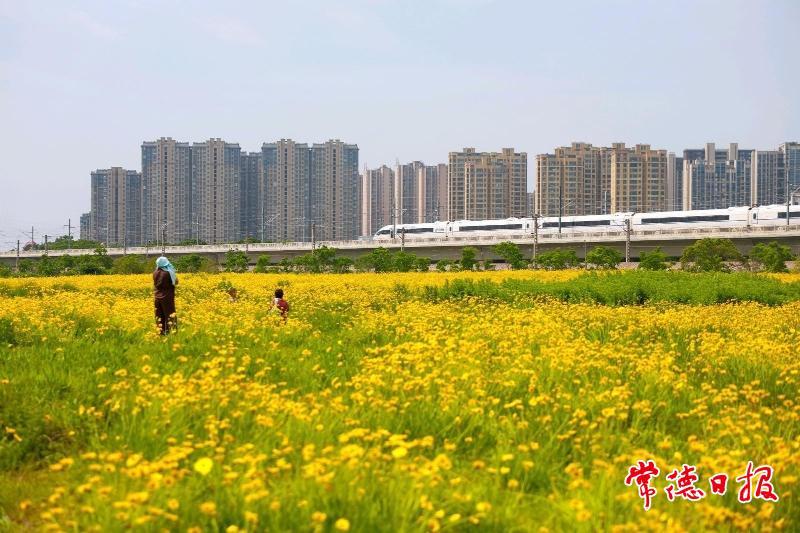 5月6日,在常德市城區太陽大道泰達潤景園小區對面,大片金雞菊燦爛綻放,金黃絢麗的景致美不勝收。呼嘯疾馳的高鐵,從這片“花?!遍g穿梭而過,引得眾多市民紛紛前來打卡,與高鐵同框。常德日報記者 蔡文龍 攝影報道