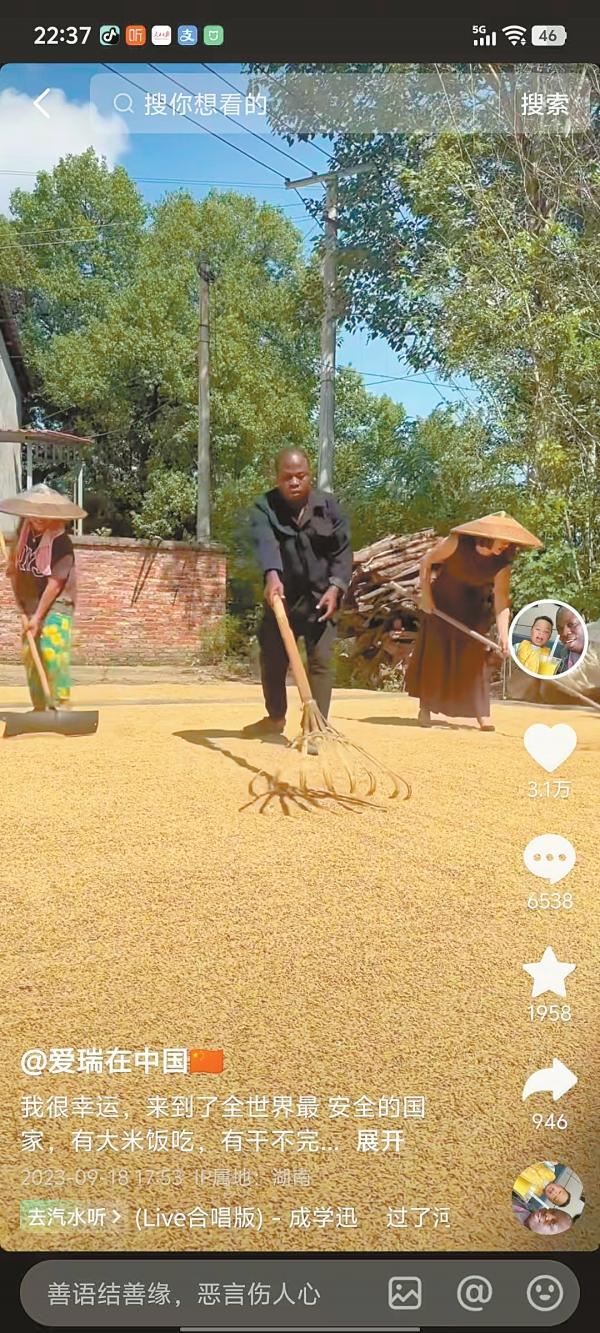“我很喜歡農村,生活很有味,人很有趣。”坐在農家院子里,穿著中山裝的愛瑞與記者分享他的感受。后來,他又拍攝了“非洲老外和娭毑(湖南方言:奶奶)斗嘴”“吃農村宴席,被熱情的村民加飯”等視頻,受到廣大網友喜愛。