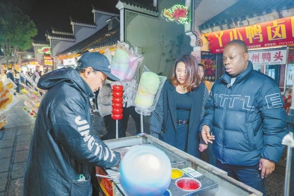 今年2月12日晚,愛瑞(右)和妻子在永州市零陵古城景區品嘗特色小吃,歡度元宵佳節。 湖南日報全媒體記者 李健 攝