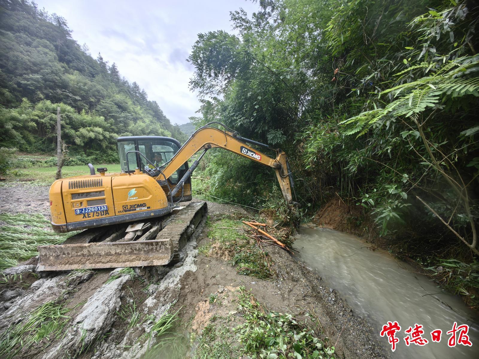 在易家灣村大峪灣片,洶涌的山洪沖垮河道,近百畝正值抽穗期的水稻田變成汪洋。19日中午,獲知險情的覃事淵與李剛緊急調來一臺挖掘機,對溝渠進行清理作業。值守的村干部和挖掘機師傅一樣,午飯是兩個冷饅頭,就著雨水咽下。