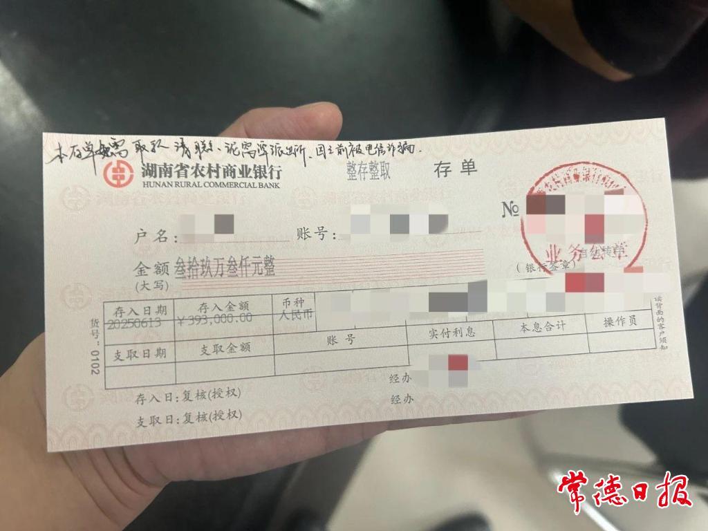 常德日報記者 鄧淇月 通訊員 孫文斌 文/圖 “本存單如需取款,請聯系泥窩潭派出所,因之前被電信詐騙。”一張帶有提示字樣的銀行存單,不僅承載了一個農村家庭畢生的積蓄,更飽含了派出所對群眾生命財產安全的貼心守護。近日,桃源縣泥窩潭鄉村民向某夫婦從民警手中接過這張存單時,終于放下了懸著的心。