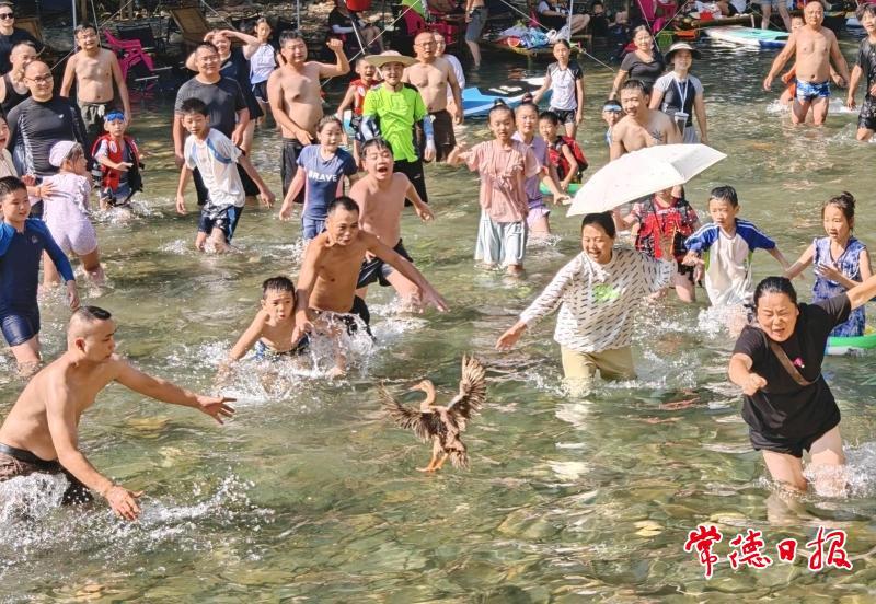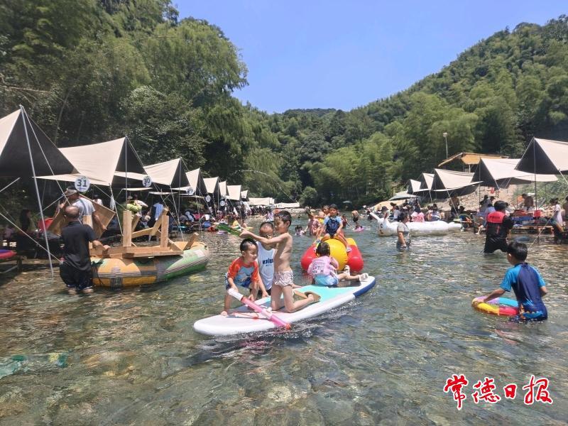 連日來的高溫天氣,讓市民紛紛尋找避暑好去處,桃源縣沙坪鎮歡竹溪水部落迎來了大批游客,成為消暑度夏的“新寵”。8月1日,記者在現場看到,前來游玩的市民游客絡繹不絕。水上樂園里,市民游客盡情嬉戲,或在溪水中暢游,或是體驗水上槳板、抓鴨子比賽、摸魚比賽等水上娛樂項目。常德日報記者 劉頌 攝