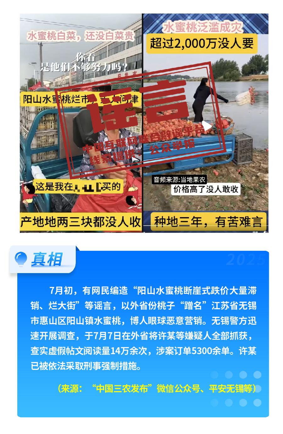 此外,7月份正值暑期旅游旺季和水果等農(nóng)產(chǎn)品收獲季,有自媒體、商家借機編造傳播涉文旅及農(nóng)產(chǎn)類謠言,干擾市場秩序,侵害消費者權(quán)益。有商家違規(guī)使用人民大會堂建筑圖片標識和名稱,仿冒人民大會堂賬號,非法售賣、倒賣參觀門票,損害游客權(quán)益。個別商家剪輯發(fā)布“江蘇無錫陽山水蜜桃斷崖式跌價、大量滯銷、爛大街”謠言視頻,再借機兜售假冒的陽山水蜜桃,博人眼球惡意營銷,擾亂市場秩序。所謂“峨眉山人猴大戰(zhàn),游客墜崖,猴王被當(dāng)場擊斃”景區(qū)安全事件一度傳得沸沸揚揚,相關(guān)視頻以驚悚情節(jié)博取關(guān)注,畫面實際是用AI合成拼接制作。