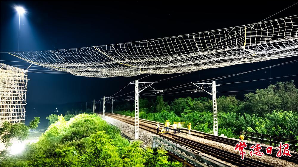 “90分鐘‘窗口期’,必須安全高效完成任務!”項目經理唐世奇的聲音穿透夜色。隨著指令下達,十余名“蜘蛛人”迅速攀上跨越架。只見,機動絞磨機的嗡鳴劃破寂靜,一張1200多平方米的巨型安全大網從鐵路北邊跨越架上緩緩地拉向南邊另一端。地面上,安全員緊盯每一個環節;高空中,作業人員隨著防護網的延伸精準操作。