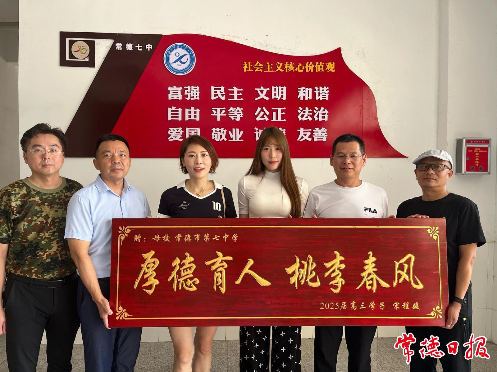 常德日報記者 黃云霞 通訊員 劉靖詩 文/圖 近日,常德市七中2025屆畢業生宋程媛和家人將一塊鐫刻“厚德育人 桃李春風”字樣的牌匾贈予母校,以此表達對學校領導和老師的感激之情。