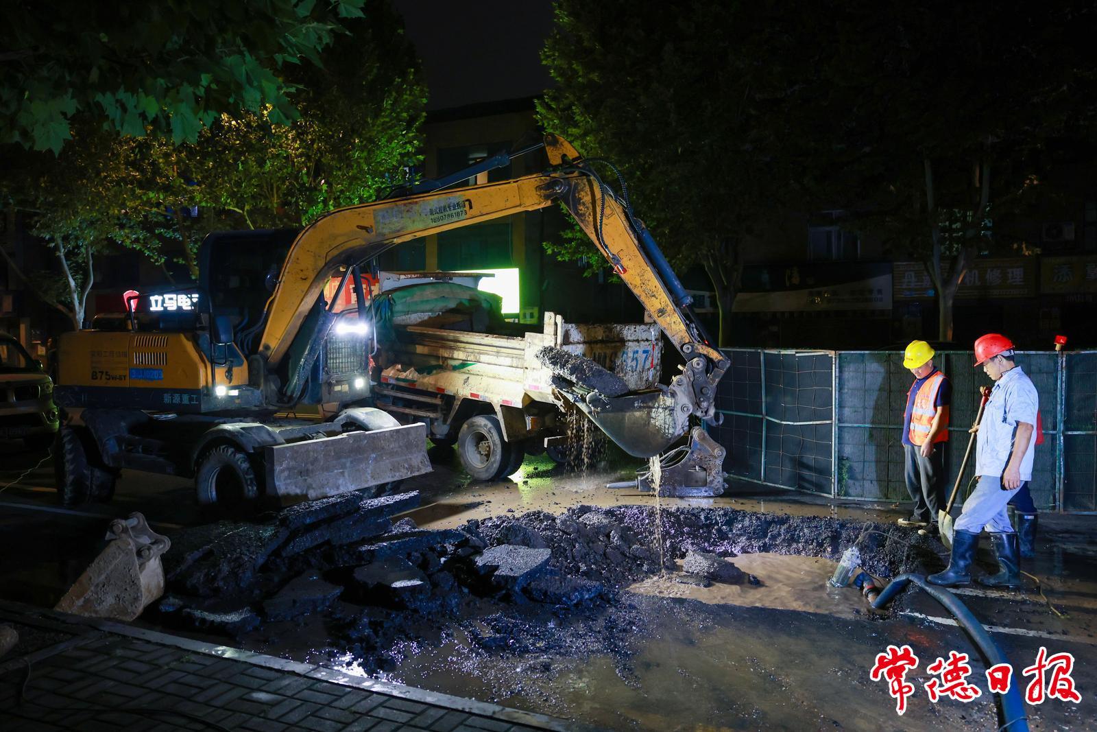 20時許,隨著晚高峰用水逐漸平穩,沃特公司施工隊伍迅速進場,搶修攻堅戰全面展開。施工現場燈火通明,銑刨機破除路面、挖掘機開挖作業、渣土車清運土方……各項工序緊密銜接、高效協同。