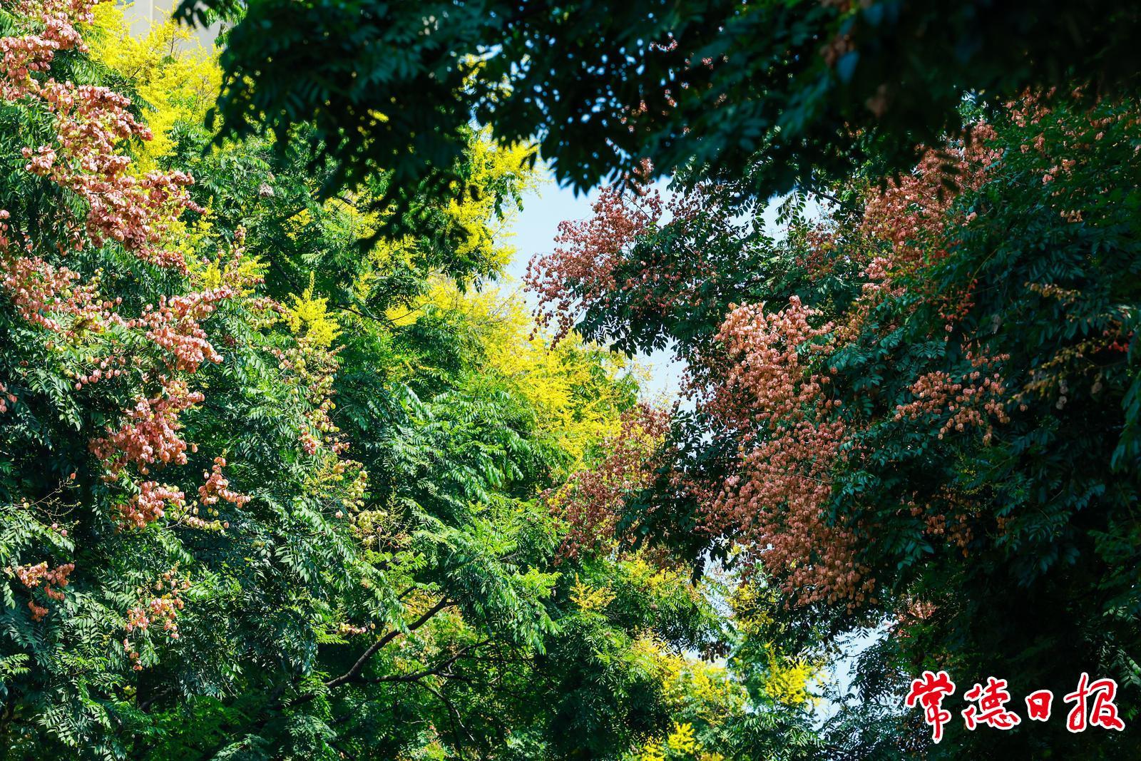 市城區水星·香榭里住宅小區的大門兩側,欒樹的枝頭異常熱烈,綠是沉靜的,黃是明凈的,粉是明媚的,紅是奔放的,每棵欒樹的樹梢都像一個舞臺。從小區里走出來的居民,立即就被這種熱烈粘住目光。小區對面的公交站臺上,幾位等車的市民都舉著手機拍照。這是9月12日下午,記者在常德市城區青年路上看到的場景。這些照片很可能會在當天或者幾日后,出現在微信朋友圈及其他社交平臺。幾周前,微信網友“宇文川穹”就發了龍港路的欒樹視頻,好似綠色的枝頭停滿了黃色的飛鳥。沒幾天,網友“檀木先生”的美圖又亮相朋友圈,嫩黃與深紅襯著碧藍的天空,明亮干凈,一如壁紙,配文亦與照片輝映:一棵欒樹開花有先后,有些已結出嫩果,更多的花卻正接連綻放——一邊是落花滿地,一邊是繁花滿樹。它們就這樣層層疊疊,黃的花、紅的果、綠的葉,交織出繽紛的層次,把整個初秋渲染得明亮而熱烈。