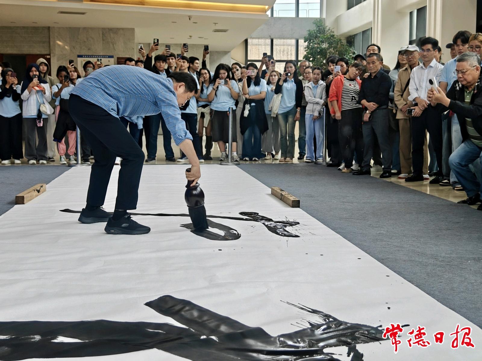 尤為引人注目的是,來(lái)自常德職業(yè)技術(shù)學(xué)院國(guó)際教育學(xué)院的79名留學(xué)生專(zhuān)程前來(lái)觀展,沉浸式體驗(yàn)中國(guó)傳統(tǒng)文化的魅力。在老師的指導(dǎo)下,留學(xué)生們手握毛筆嘗試創(chuàng)作,寫(xiě)下“開(kāi)心”“我愛(ài)中國(guó)”等內(nèi)容,感受書(shū)法藝術(shù)。