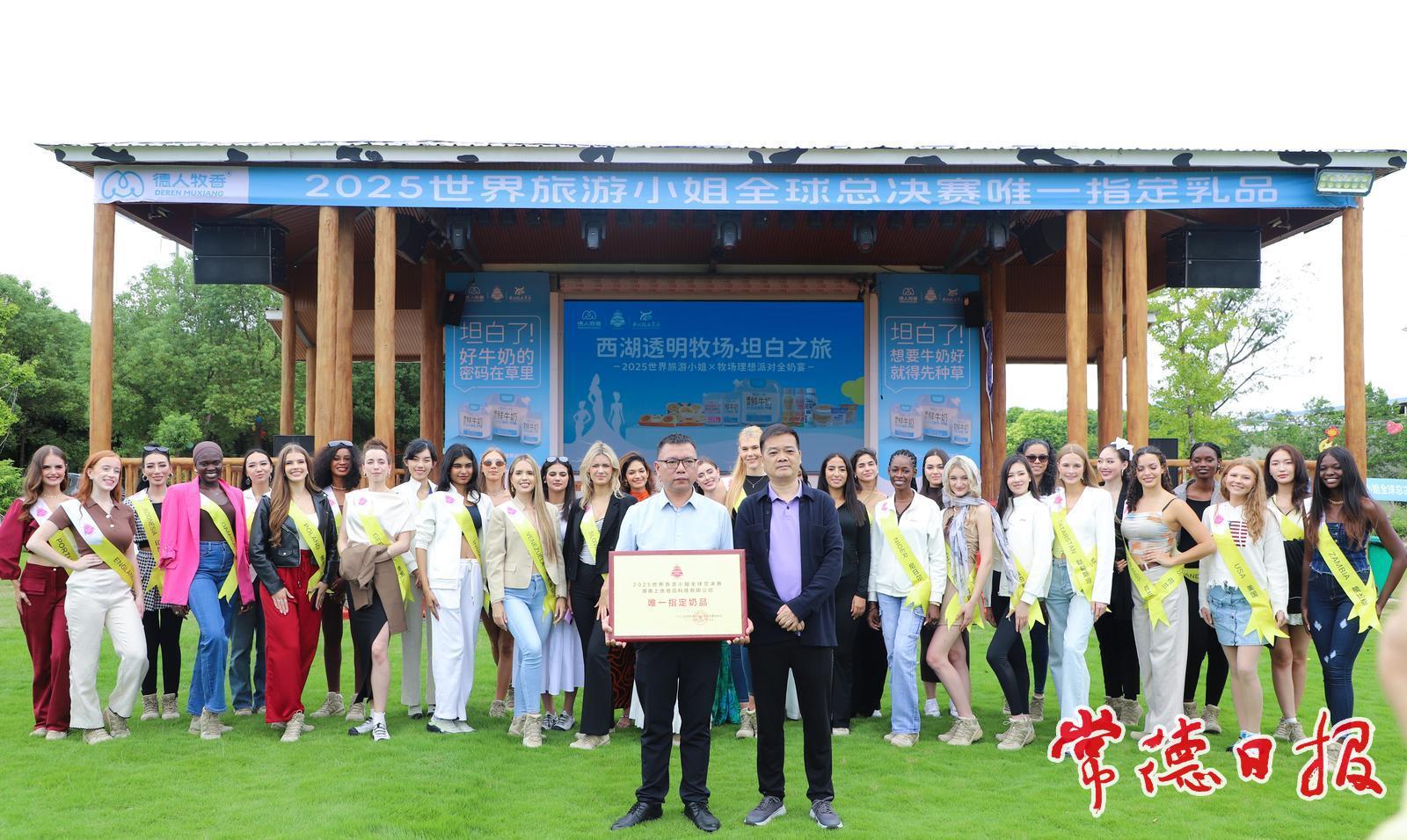 承載佳麗的車隊從常德柳園錦江酒店出發,大巴車懸掛的“德人牧香——2025 世界旅游小姐全球總決賽唯一指定奶品”橫幅,成為此行首個“西湖標識”。首站德人牧香市區政府店,8位佳麗在奶香中品嘗鮮乳品,齊聲喊出“常喝德人奶,健康美一天!”隨后抵達上優食品科技,她們參觀奶牛科普館、走進牛奶加工透明工廠,透過玻璃見證自動化流水線運轉,并在前坪合影定格“產業與美麗碰撞”的瞬間。