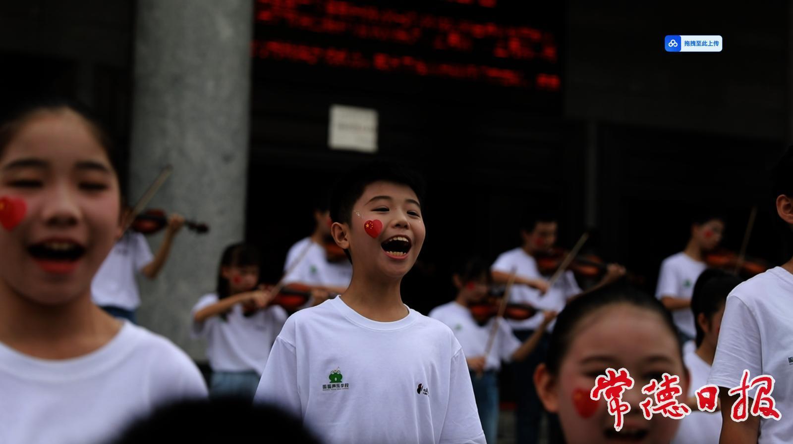 “站在常德這片沃土,讓歷史的回響與時代的強音,共同譜寫成禮贊祖國的圣歌。”隨著常德博物館講解員話音落下,幾名領唱員清亮的嗓音率先劃破周末清晨的寧靜,“紅星閃閃,放光彩……”熟悉的旋律瞬間點燃現場氛圍。緊接的是悠揚的小提琴聲合奏,以及百余名少年兒童齊聲高歌。他們精神抖擻,手中揮舞著鮮艷的旗幟,稚嫩而有力的合唱聲在博物館廣場上空回蕩。不少晨練或路過的市民紛紛駐足,有的舉起手機記錄下這意外而動人的一幕,有的則情不自禁地跟著旋律輕聲附和。