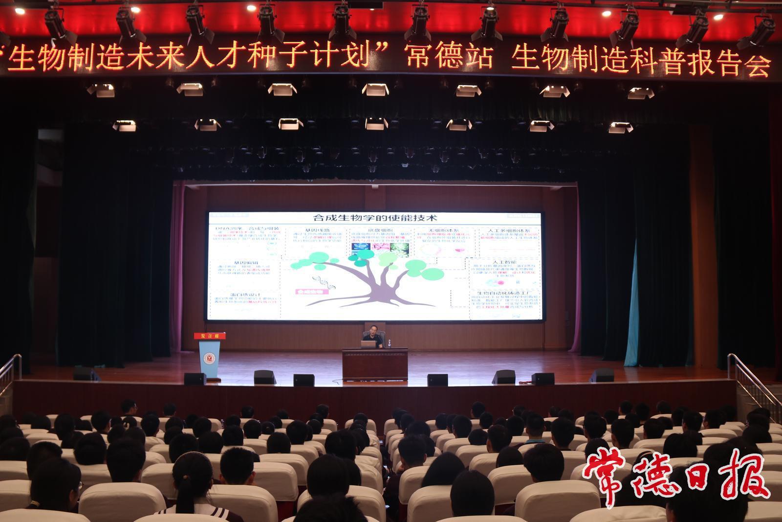 常德日報記者 羅希 文/圖 9月26日,“生物制造未來人才種子計劃”科普報告會在常德市第一中學(xué)舉行,3位知名專家為學(xué)子普及生物制造知識,播下科技創(chuàng)新“種子”。副市長袁世平出席報告會。
