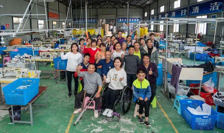 2020年10月13日,在湖南省邵陽市城步縣湖南七七科技股份有限公司生產車間,楊淑亭(前排中)與工友合影。新華社記者 才揚 攝